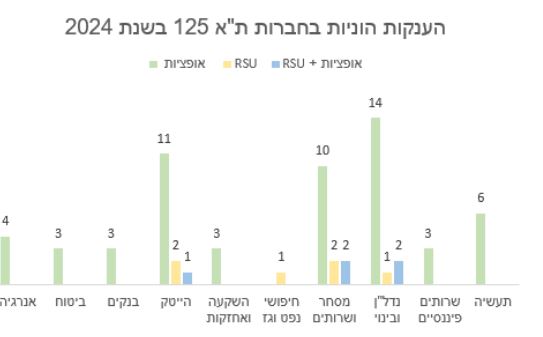 סקירת השוק מלמדת כי בקרב החברות הציבוריות הנכללות במדד תל אביב- 125 הענקת אופציות היא המועדפת, וכי רק כ-% 16 הקצו RSUבשנת 2024 (וכמחציתן העניקו תמהיל משולב עם אופציות), בחלוקה לענפי הפעילות שלהלן
